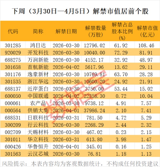 万润新能下周解禁市值近49亿元。近期,公司股价在大盘下跌的背景下,持续走强,3月以来逆市上涨超33%。公司主营磷酸铁锂正极,目前全球出货量排名前三。公司2025年亏损4.46亿元,同比减亏。