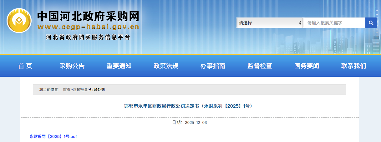 从中国河北政府采购网获悉,2025年12月1日,因政府采购合同未及时公告备案,邯郸市永年区人力资源和社会保障局被邯郸市永年区财政局行政处罚。