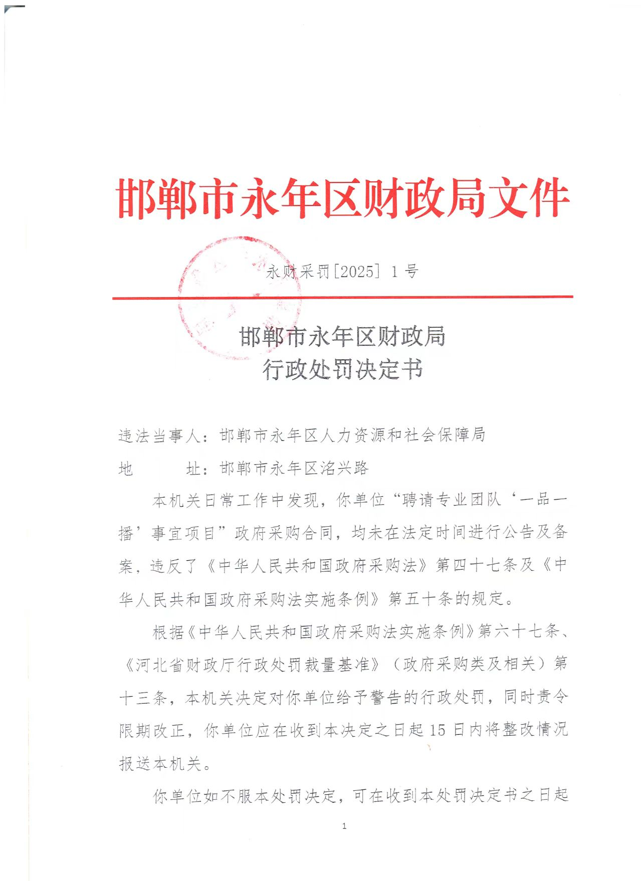 “永财采罚[2025]1号”行政处罚决定书显示,邯郸市永年区人社局“聘请专业团队‘一品一播’事宜项目”政府采购合同,均未在法定时间进行公告及备案,违反了《中华人民共和国政府采购法》第四十七条及《中华人民共和国政府采购法实施条例》第五十条的规定。